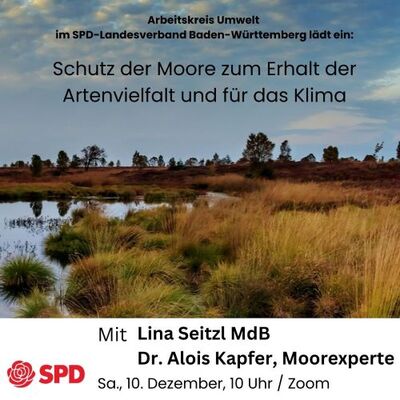 Im Namen der Organisationsgruppe mit Gabi Rolland, Prof. Dr. Willfried Nobel, Dr. Lina Seitzl, Viviane Sigg und Ariane Bergerhoff laden wir herzlich ein zu unserem nächsten digitalen Treffen auf Samstag, 10. Dezember um 10 Uhr, zu dem Thema „Schutz der Moore zum Erhalt der Artenvielfalt und für das Klima“. Die Moore sind nicht nur einzigartiger Lebensraum für Pflanzen und Tiere, sondern sie sind auch einer der besten Speicher für Kohlendioxid (CO2). Dennoch sind sie selbst durch den Klimawandel bedroht, aber vor allem wurden und werden sie durch Eingriffe zerstört. Um dem entgegenzuwirken, haben Bund und Land Moorschutzstrategien entwickelt, die es umzusetzen gilt. Was das genau bedeutet, wollen wir in dieser Sitzung besprechen.